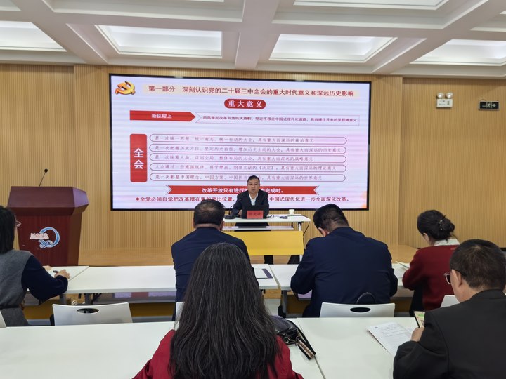 殷大斌从深刻认识党的二十届三中全会的重大时代意义和深远历史影响、深入学习领会习近平总书记在党的二十届三中全会上的重要讲话精神、全面准确理解《决定》提出的进一步全面深化改革重大举措、全力以赴抓好全会精神贯彻落实等四个方面进行了宣讲报告,帮助全体党员全面深入领会党的二十届三中全会精神实质,准确把握进一步全面深化改革、推进中国式现代化的重大部署。殷大斌指出,全体党员要把学习和贯彻好党的二十届三中全会精神作为当前和今后一个时期的重大政治任务,准确把握学校党委关于抓好全会精神贯彻落实的部署要求,在全校持续兴起学习贯彻党的二十届三中全会精神的热潮,全力推动全会精神在学校落地落实、见行见效。