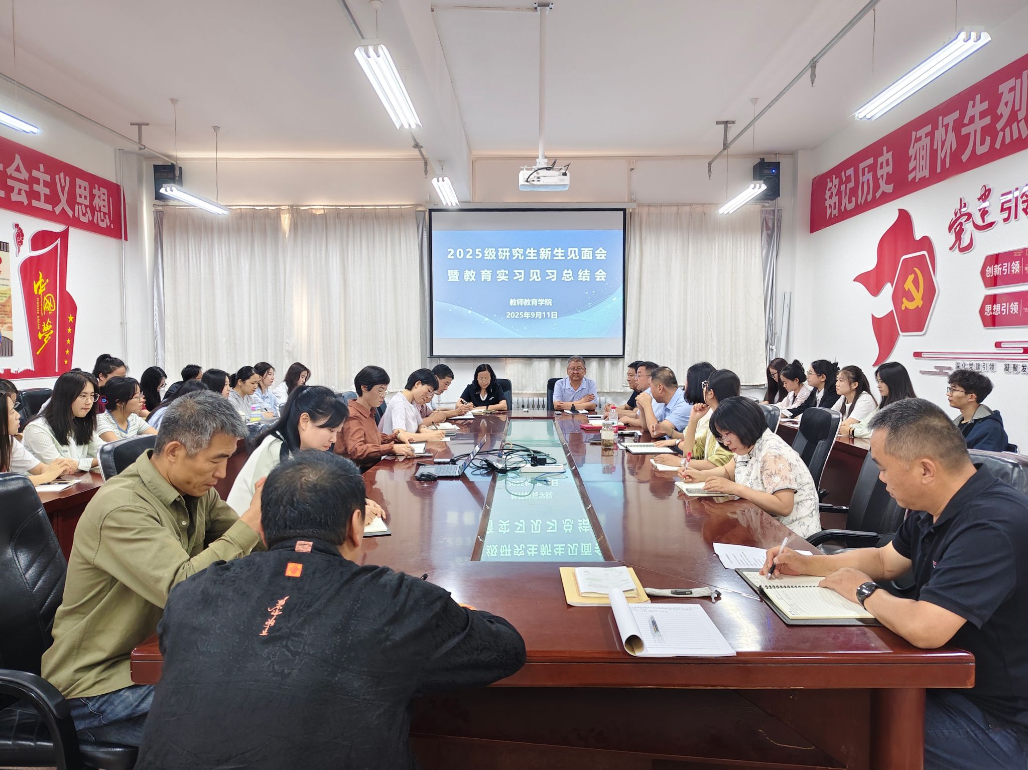 9月11日,tyc8722太阳集团城召开2025级研究生新生见面会暨教育实习见习总结会。会议由学院负责人主持,全体研究生校内导师、班主任及2023级、2024级、2025级研究生参会。