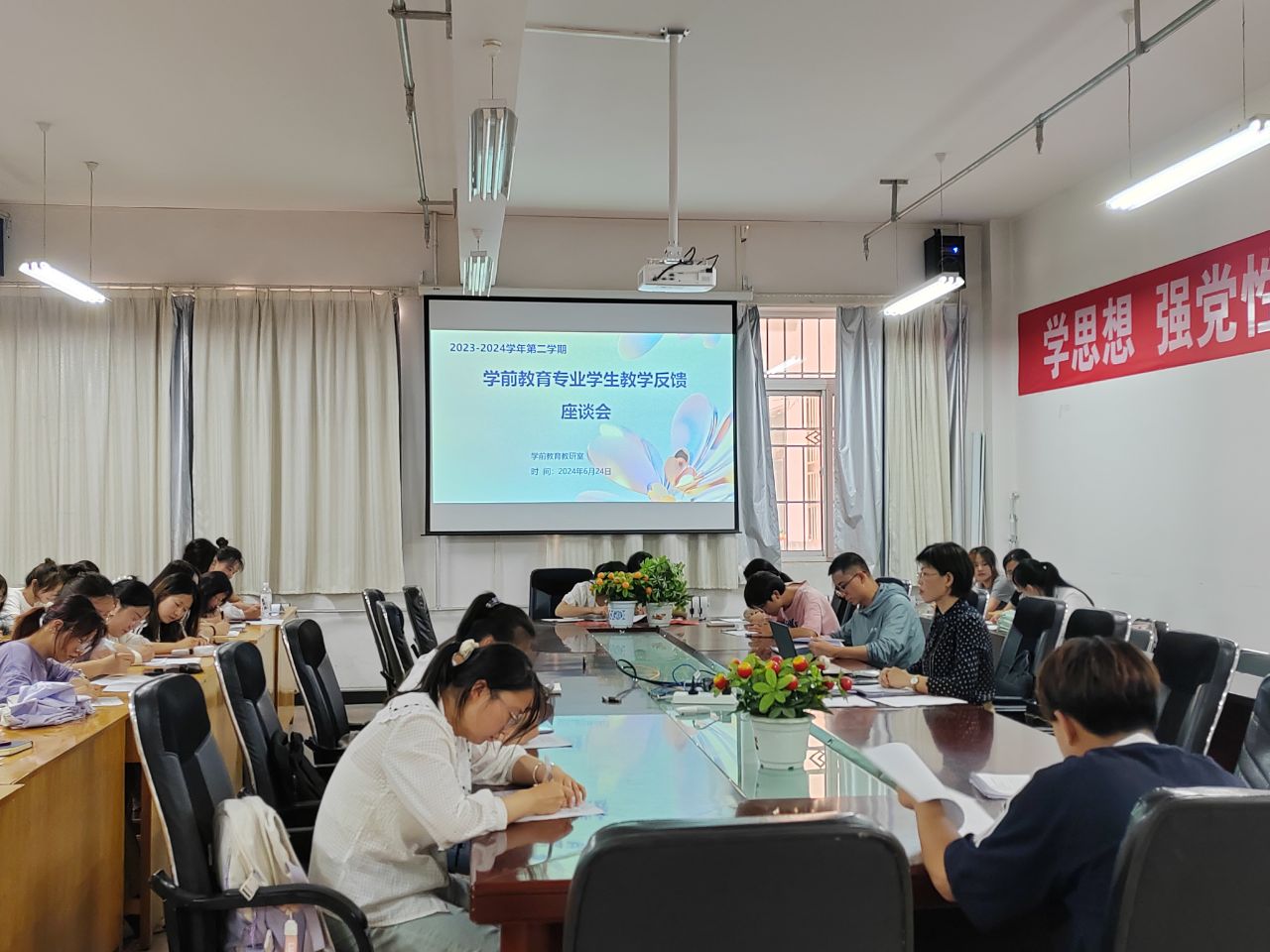 6月24日下午,tyc8722太阳集团城学前教育教研室举行学生教学工作反馈座谈会,座谈会由学前教育专业负责人主持,学前教育教研室李彦平老师及学前教育2021级、2022级、2023级三个年级9个班级的35名学生代表参加了座谈会。