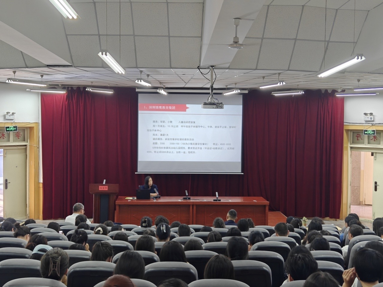 会上,学院院长雒焕国教授从教育实习的重要性、教育实习目的、内容、要求及实习地区等方面对教育实习进行了全面详细地讲解。随后,学院党委书记王莉教授详细介绍了赴深圳、广州等地开展访企拓岗期间走访的雏鹰教育集团、大唐明升教育集团与广州同仁教育集团等三家教育集团的岗位设置、用人需求、薪资待遇及实习带就业等方面的情况,并鼓励同学们要转变就业观念,尽早做好就业规划,为将来高质量就业做好各方面的准备。