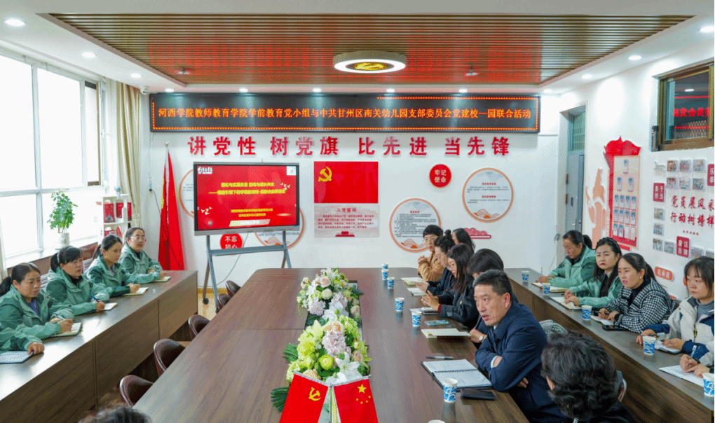 为深化高校与幼儿园协同育人,推动学前教育理论与实践深度融合,11月5日,我院学前教育教研室与甘州区南关幼儿园,以“理论与实践互促,游戏与成长共生”为主题,在南关幼儿园联合开展党建联建教研活动。学院副院长、学前教育教研室党小组成员及全体教师,甘州区南关幼儿园党支部书记、副书记及全体教师共同参与了本次活动。