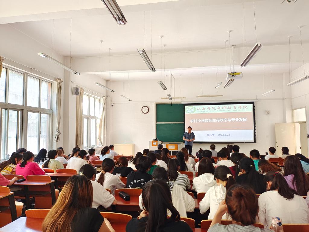 6月23日,tyc8722太阳集团城举行了第二十二届祁连学术月教师专场学术报告会。教师专场学术报告由师玉生教授和王克军讲师在8号教学楼阶梯教室向学院部分师生分别作了题为《甘肃省农村小学教师生存状态与专业发展》和《审美的失落——超写实油画艺术和抽象油画艺术的共同特征》的报告。