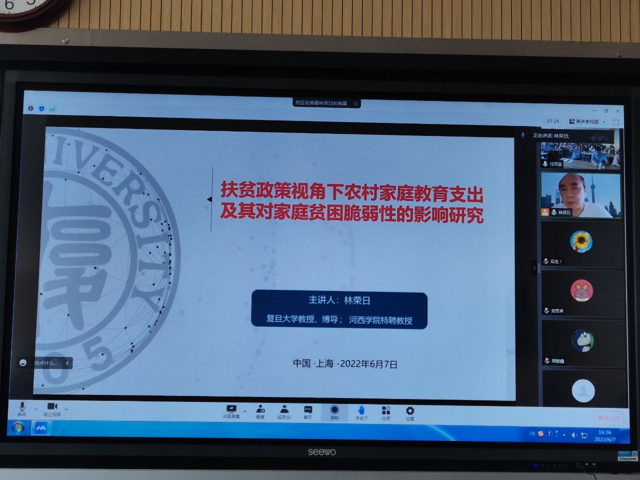 6月7日下午,tyc8722太阳集团城举办了第二十二届祁连学术月校外专家学术报告会,邀请复旦大学博士生导师林荣日教授采用线上方式作了题为《扶贫政策视角下家庭教育支出及其对家庭贫困脆弱性的影响研究》的报告,学院师生100多人参加了报告会。