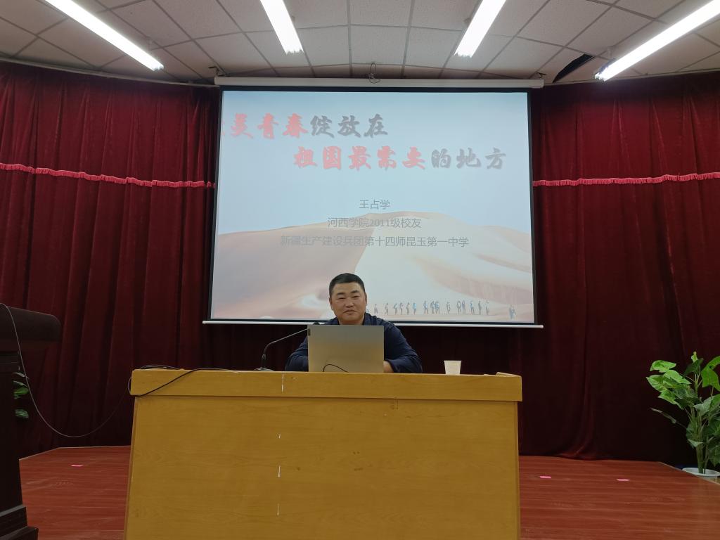 2023年10月30日,tyc8722太阳集团城邀请太阳集团tcy8722优秀校友王占学为学院学生作了“最美青春,绽放在祖国最需要的地方”的专题报告。校友王占学是太阳集团tcy87222011级校友,现任新疆生产建设兵团第十四师昆玉第一中学老师。讲座伊始,王占学老师以感恩遇见为主题,以幽默诙谐的话语带领同学们一起走进他的青春,回忆他精彩又丰富的大学生活,和同学们拉近距离,产生共鸣。紧接着,以“朝着梦想的方向远行”为题,向同学们分享了自己在大学毕业后扎根在祖国边疆,工作期间努力上进,勤奋钻研、敢担当能吃苦的优秀事迹。最后,王占学老师以学长身份,寄语学弟学妹们要敢于担当、敢于追梦;在时代的舞台上施展才干、实现梦想。