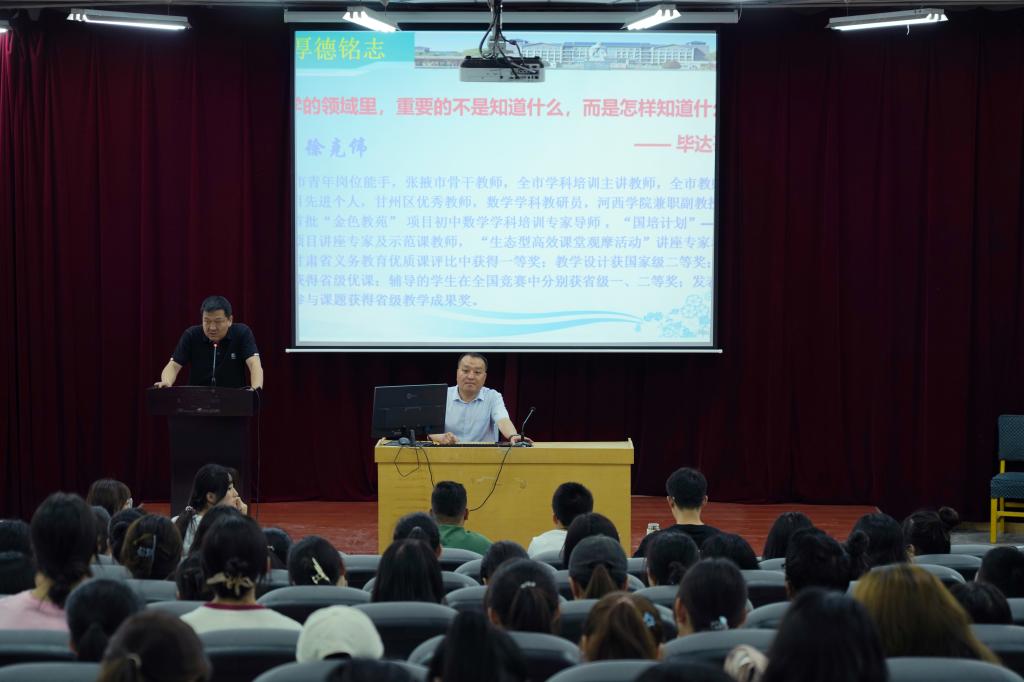 6月13日上午,甘州区大成学校校长徐克伟作了题为“教师专业成长及课堂教学实践与思考”的报告。徐克伟老师结合自己从教经历向同学们介绍一名教师的成长路径,指出要成为一名“专业化”教师,我们要具备将“压力”化为弹力的能力,要具备道德素养、专业知识、教育能力等素养。在实际的课堂教学中,要从意识-习惯-能力-精神四个层次来提高自己,形成自己在教学中的独特人格。