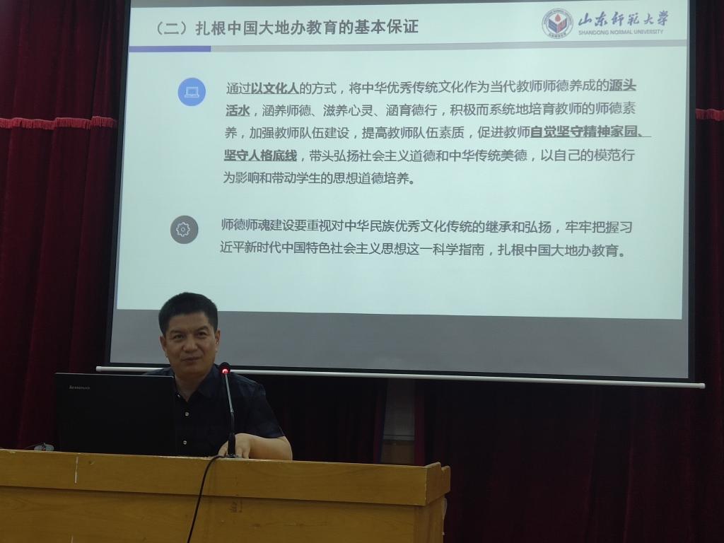 6月15日下午,孙宽宁教授为学院师生作了“教师的自我发现与专业成长”的学术报告。报告中,孙教授阐述了教师工作的三重属性、教师工作的自我回归、教师专业成长的机制和路径,孙教授结合大量的教学案例让师生感受和理解了“教育事业即求道人生”的真谛。冯永刚教授作了“以中华优秀传统文化滋养师德师魂”的学术报告。冯教授围绕习近平总书记在全国教育大会上的讲话精神阐述了以中华优秀传统文化滋养师德师魂的重要意和基本内涵,并从优秀传统文化坚定教师理想信念、厚植教师仁爱之心、提升教师师表形象、锤炼教师道德意志、激发教师道德智慧以及打造教师道德发展共同体等方面提出了优秀传统文化铸就师德师魂的路径。